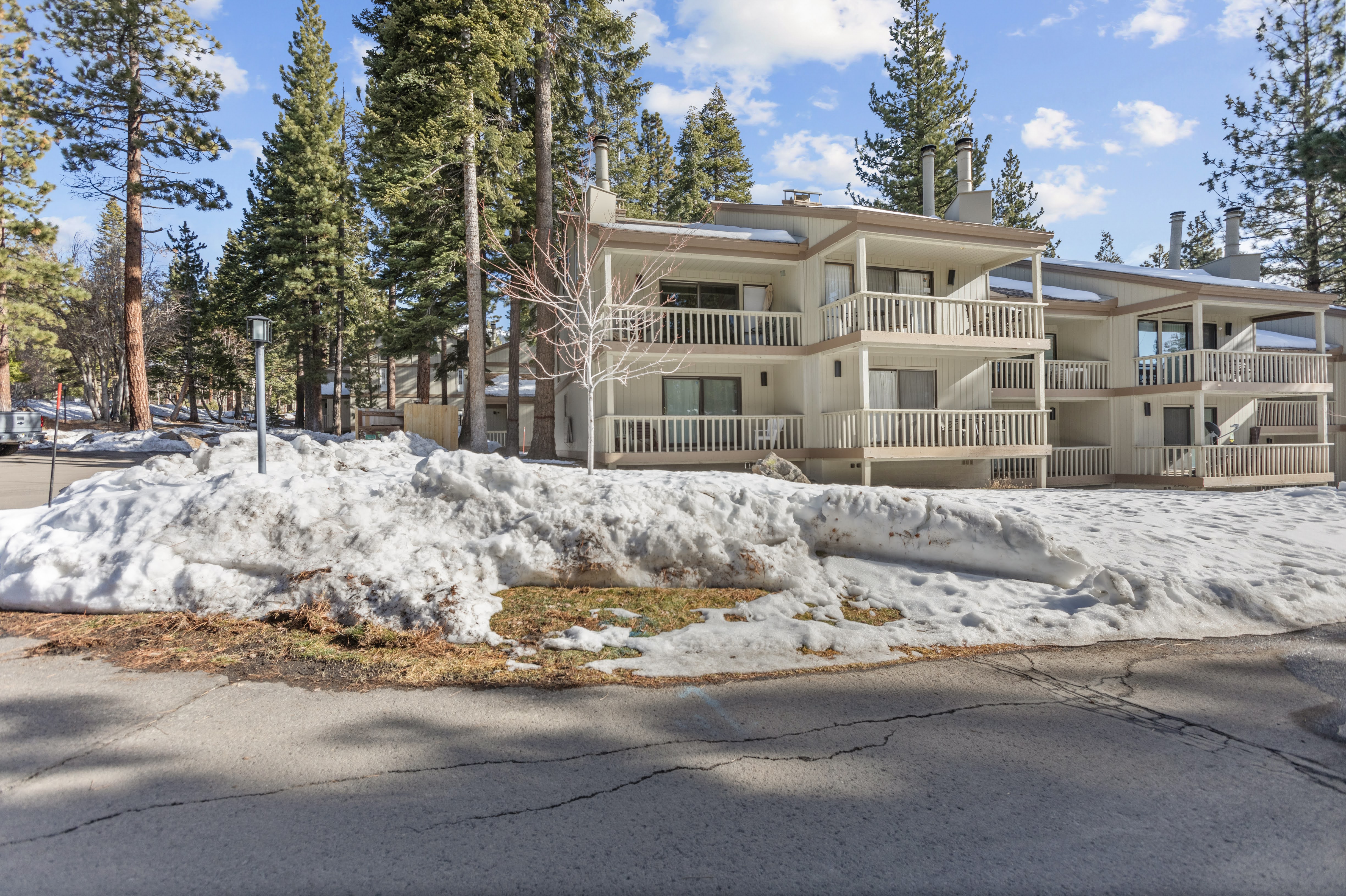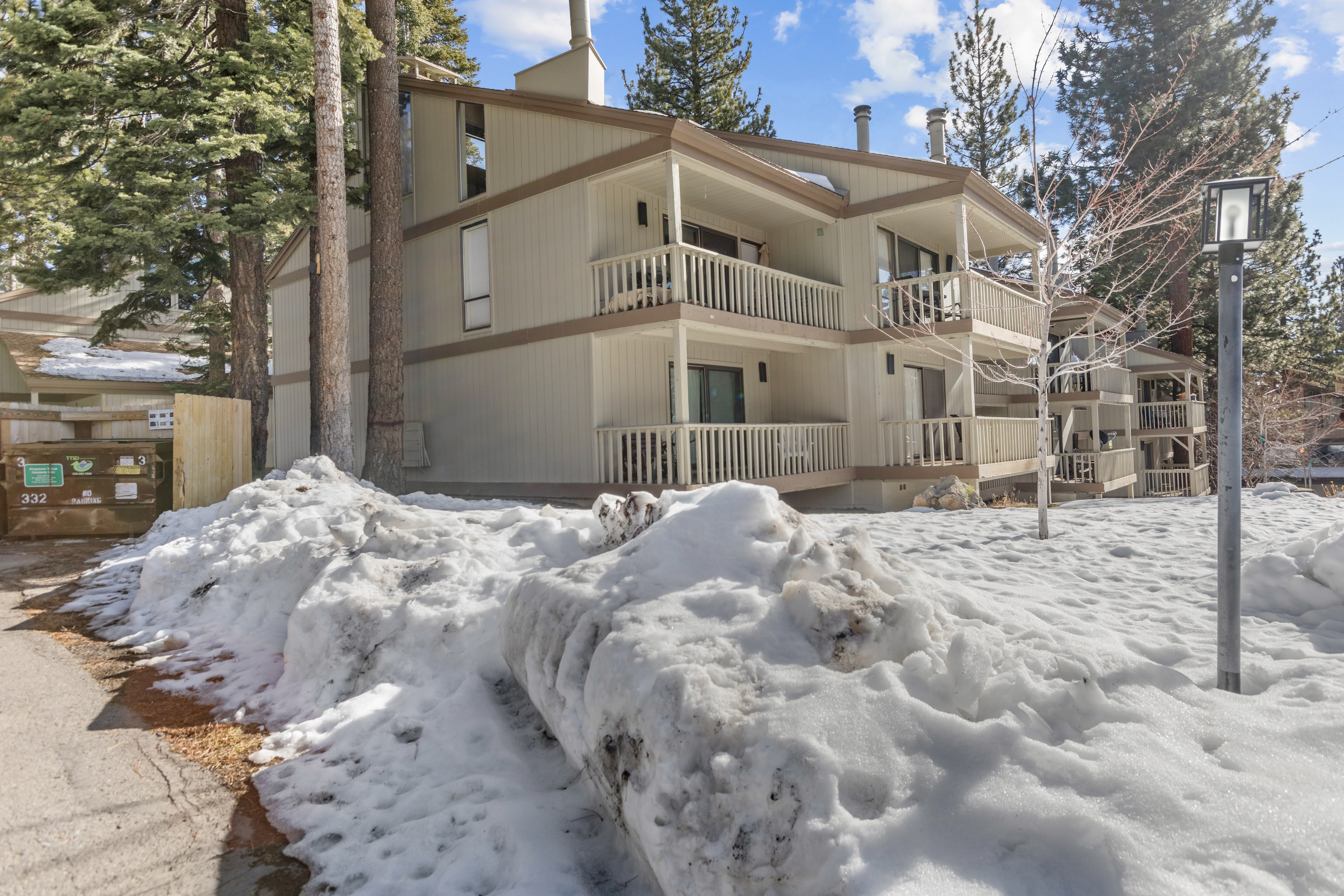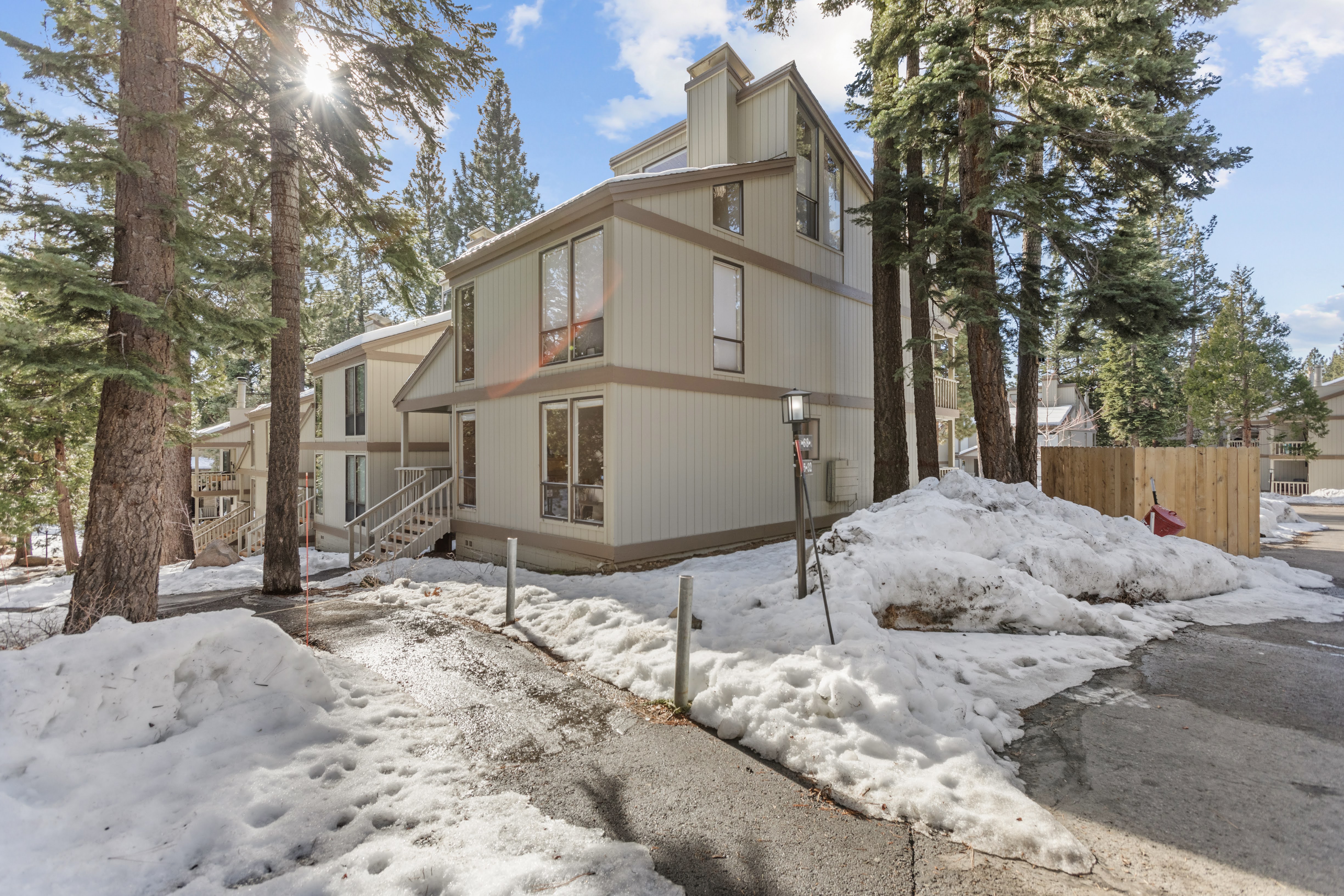 The property exterior nestled among Jeffrey pines