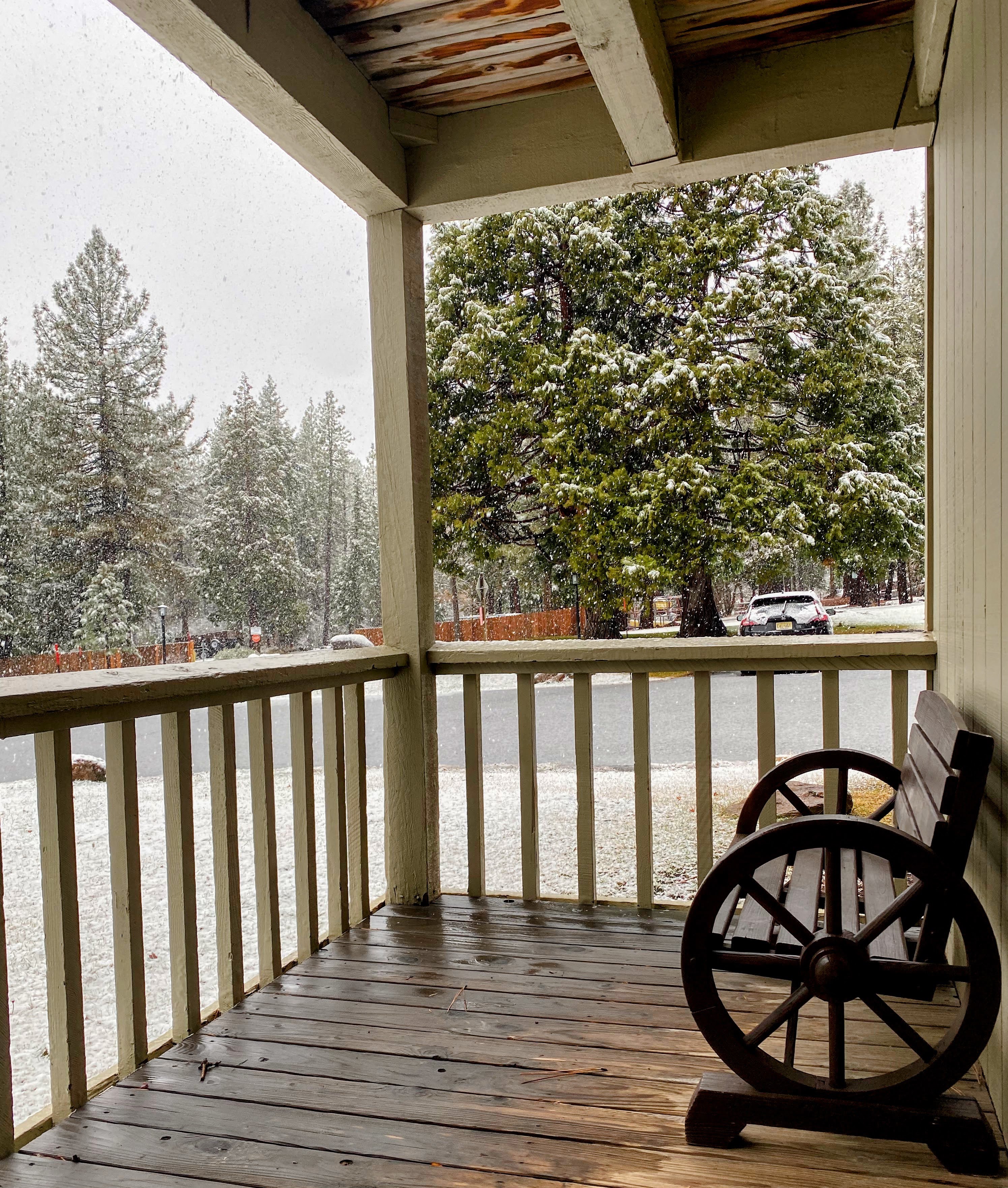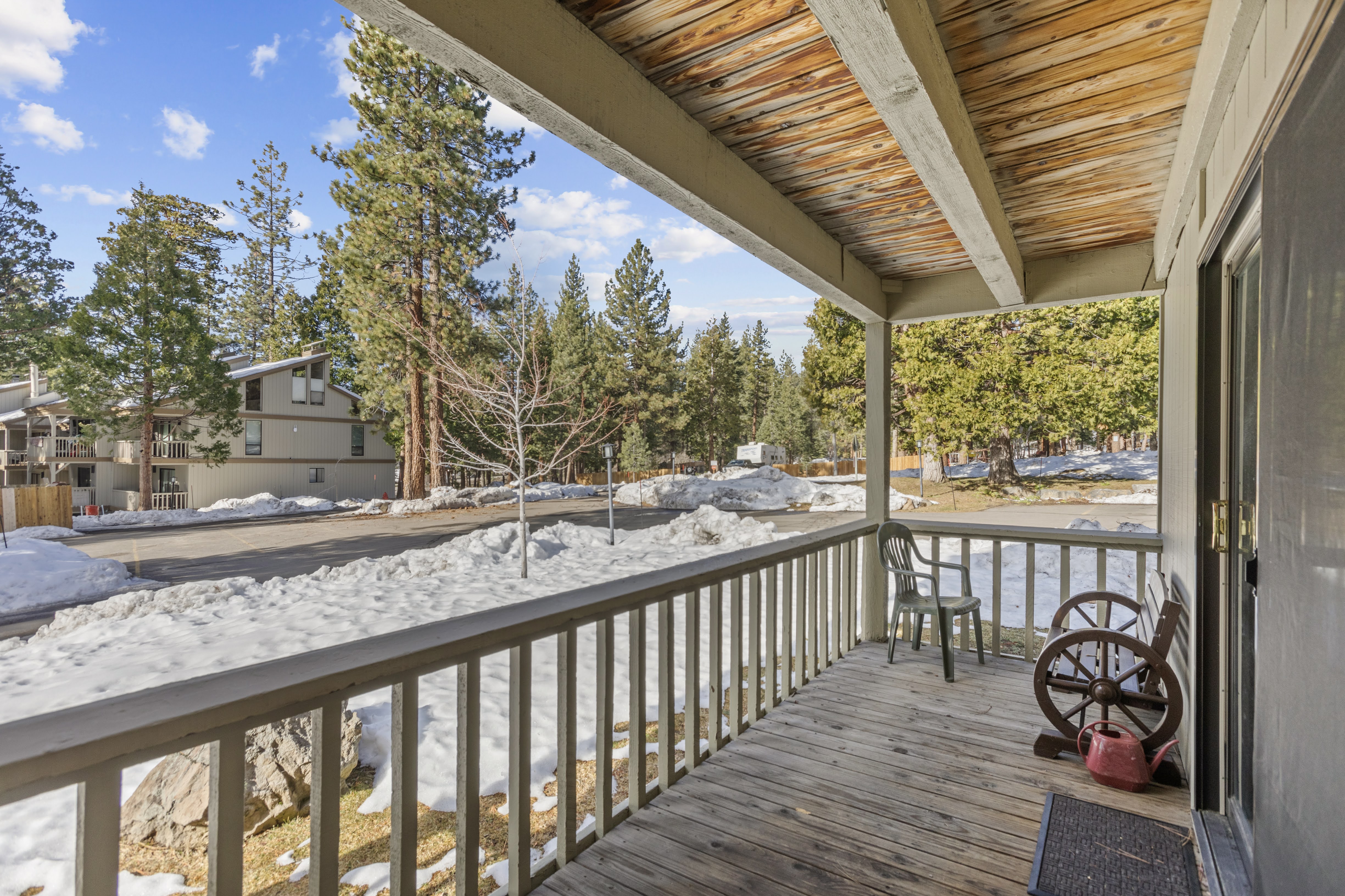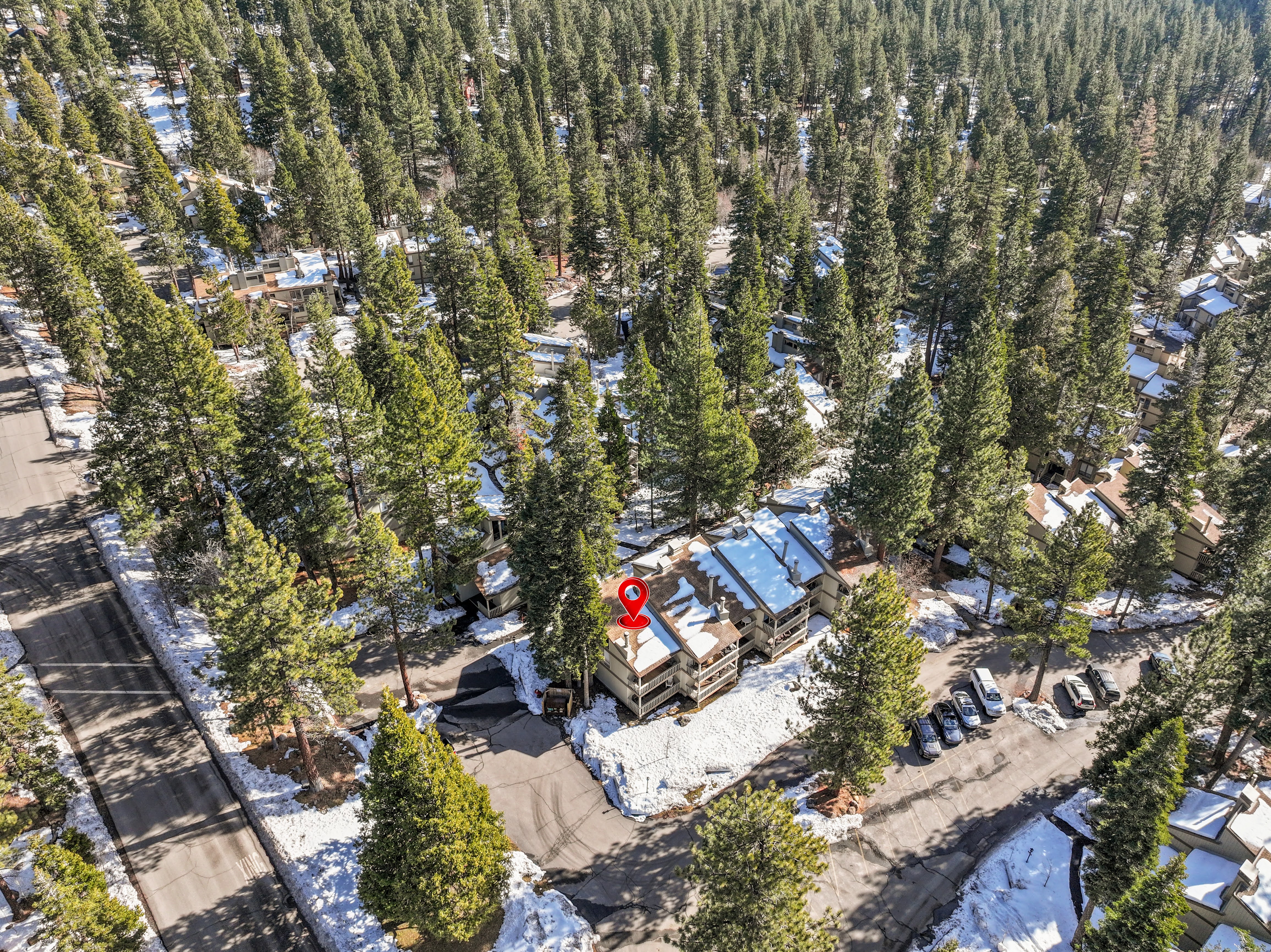 The property exterior nestled among Jeffrey pines